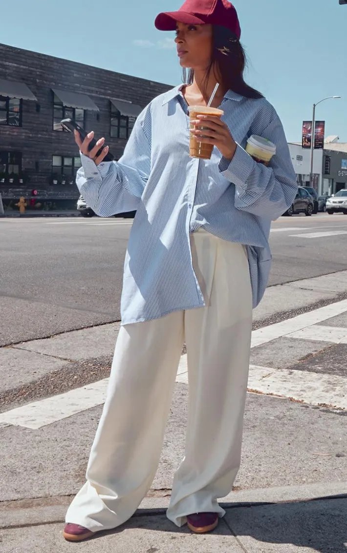 On the hunt for a new season wardrobe staple? No problem, this blue striped oversized cotton shirt is for you. With a dreamy blue shade, striped detailing for a chic finish, cotton material for extra comfort and an oversized fit, you won’t be able to resist. Style with your fave wide leg linen pants, some fresh sneakers and a statement cap, and you’ll be set for a fool-proof finish.