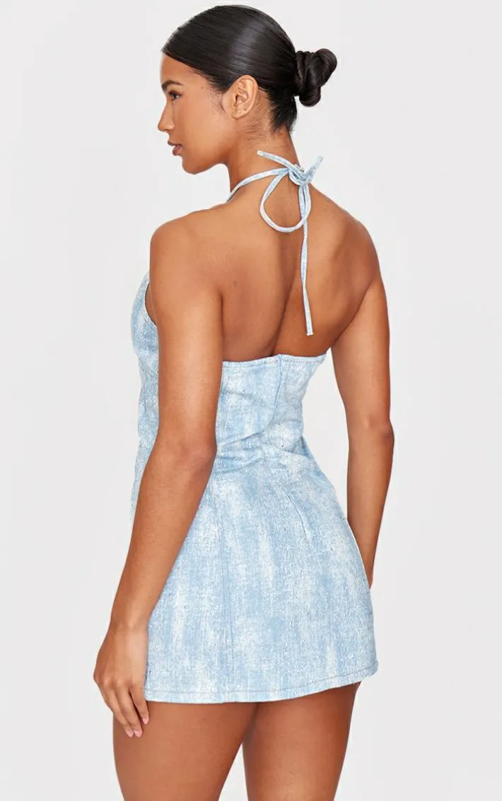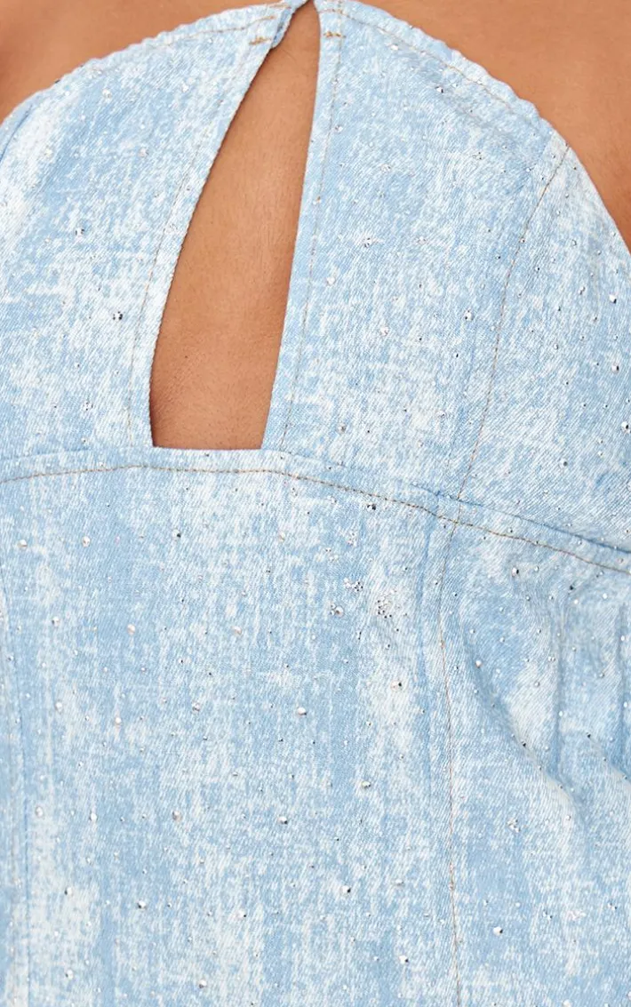 Own the night in this blue studded diamante denim keyhole mini dress. Brought to you in a blue hue denim material with a studded diamante design and keyhole cut out detail, this mini dress is a must have. How can you resist? Style with silver heels and accessories for a chic evening look everyone will be asking about.