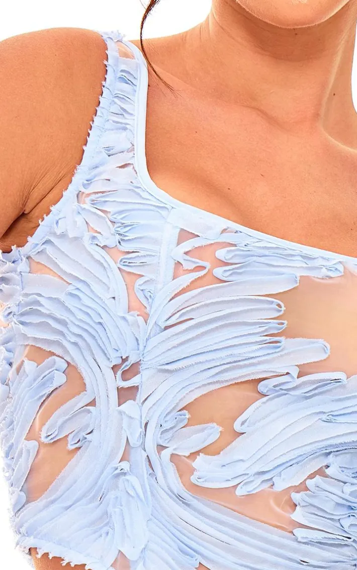 Bring all the glam vibes to your weekend wardrobe with this blue textured chiffon asymmetric hem corset. Brought to you in a blue hue chiffon material with a textured detail and asymmetric hem design, this corset is a must have. How can you resist? Style with the matching top, high heels and your fave accessories to steal all the stares.