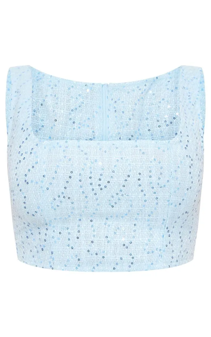 Get your glow on this season in this blue textured sequin button up crop top. Brought to you in a blue textured sequin material with a button up fastening, this crop top is turning heads for all the right reasons. Style with the matching skirt, silver heels and your go-to accessories for a combo we’re crushing on. How can you resist?