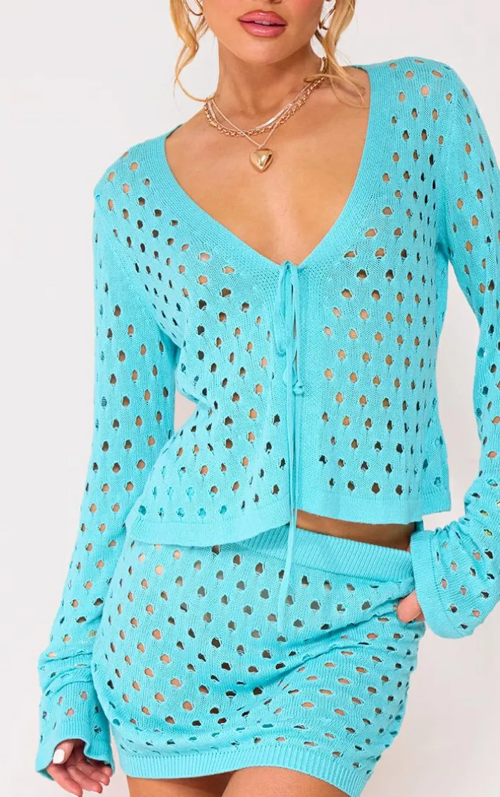 Take your new season look to a whole new level with this blue tie front hole knit top. Brought to you in a blue hue knit material with a tie front design and long sleeves, you really can’t go wrong. Style this blue top seamlessly with the matching mini skirt, flatform sandals and statement gold accessories for a look we just can’t get enough of.