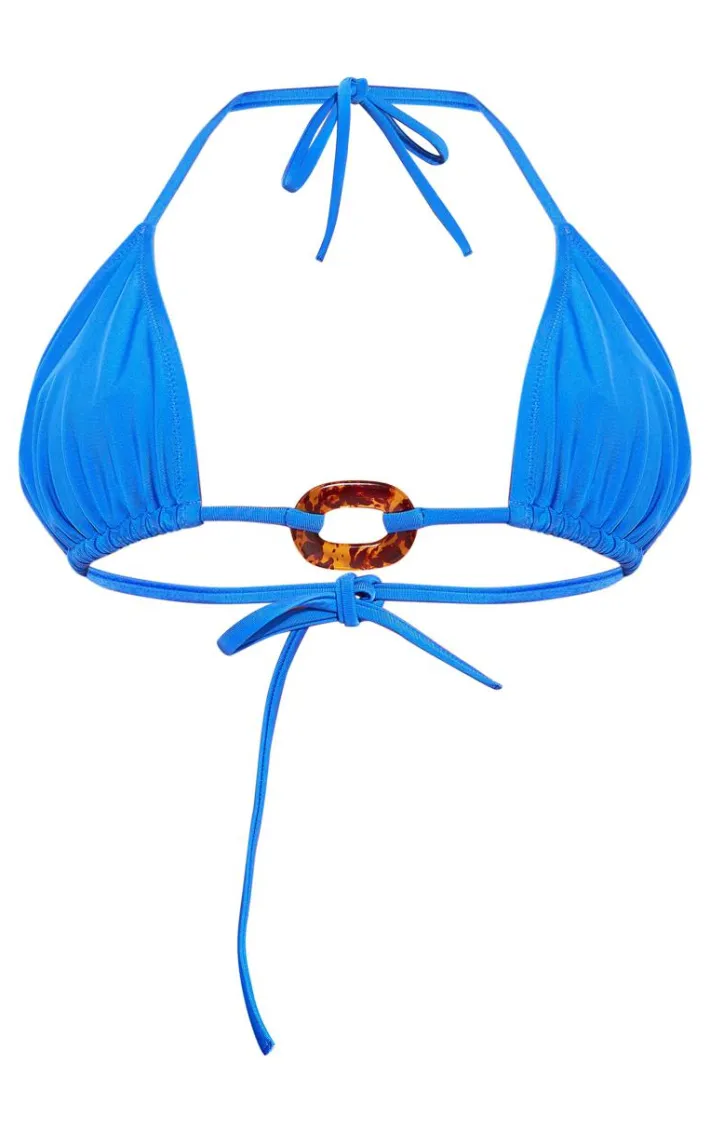 Dive into this season’s style trends with this blue tortoise trim triangle bikini top. Brought to you in a blue material with a tortoise trim detail and triangle cup, this bikini top is dreamy. Style with the matching bikini bottoms and your fave accessories for a combo we’re crushing on.