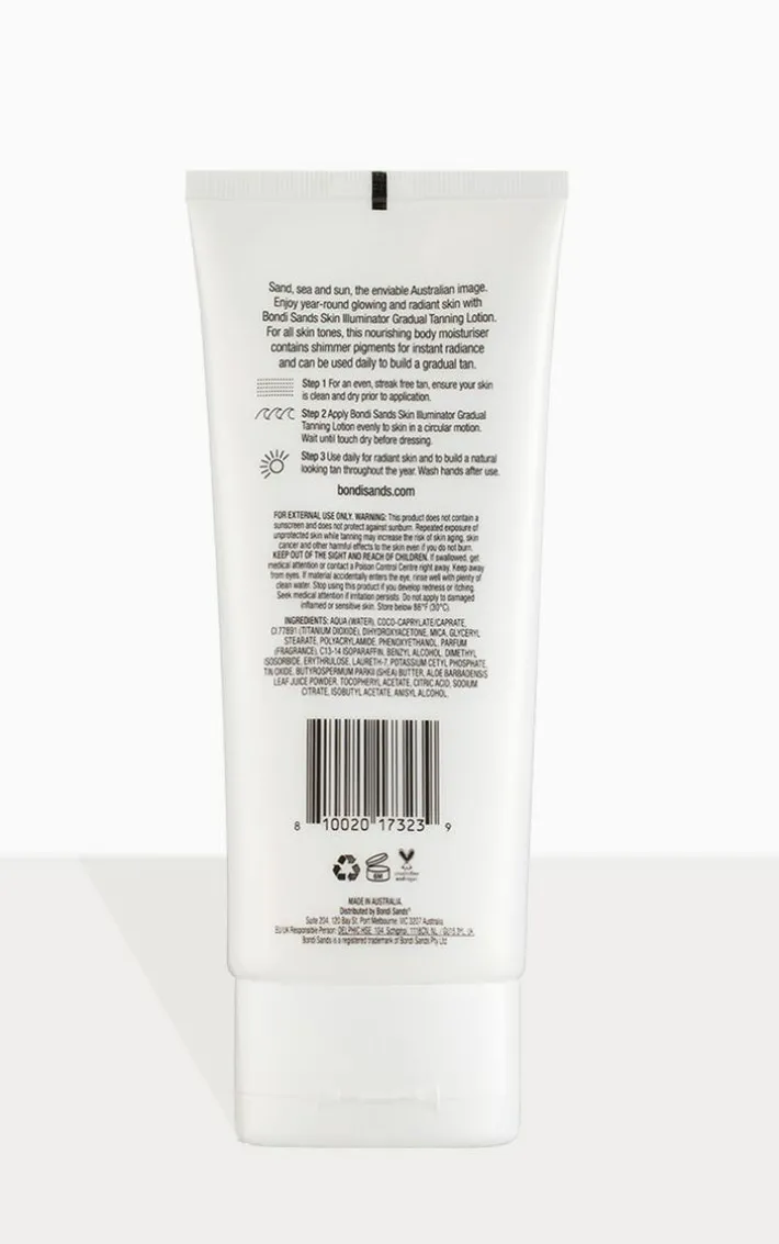 Sand, sea and sun, the enviable Australian image.Enjoy year-round glowing and radiant skin with Bondi Sands Skin Illuminator Gradual Tanning Lotion. For all skin tones, this nourishing body moisturiser contains shimmer pigments for instant radiance and can be used daily to build a gradual tan.
