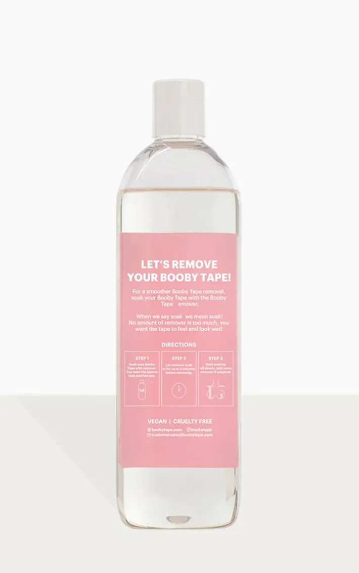 Allow the remover to soak in for up to 5 minutes before removing. If done effectively you will visibly be able to see the remover breaking down the adhesive in the Booby Tape, and the tape slowly peeling away from your skin.