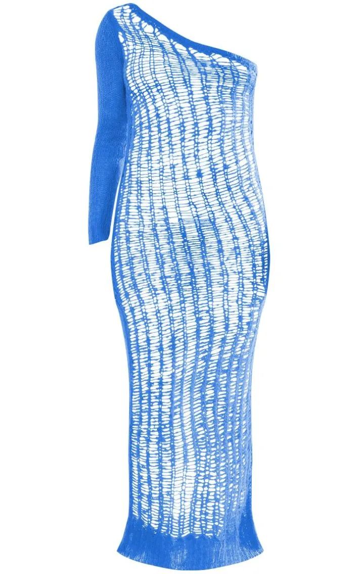 Add some drama into your vacay wardrobe with this bright blue distressed open knit one sleeve midaxi beach dress. Brought to you in a bright blue knit material in a distressed design, we are seriously obsessed. With it’s one sleeve fit and midaxi length, you’re sure to have all eyes on you. To complete the look style with some clear heels and your fave bikini to finish this vacay look we are loving.