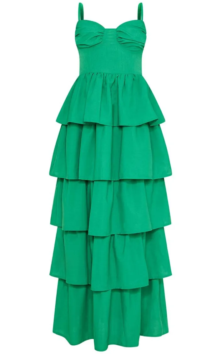 Get totally occasion ready in this stunning maxi dress. Featuring a bright green fabric with cup detailing and a tiered design, what’s not to love? Finish off the look with statement accessories and barely there heels for a look we’re loving.