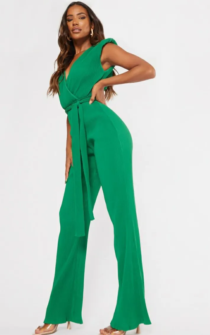 This jumpsuit is everything we’re currently vibing. Featuring a bright green material with pleated shoulder pad detailing and flared legs, style this with heels and simple accessories for a look we’re loving.