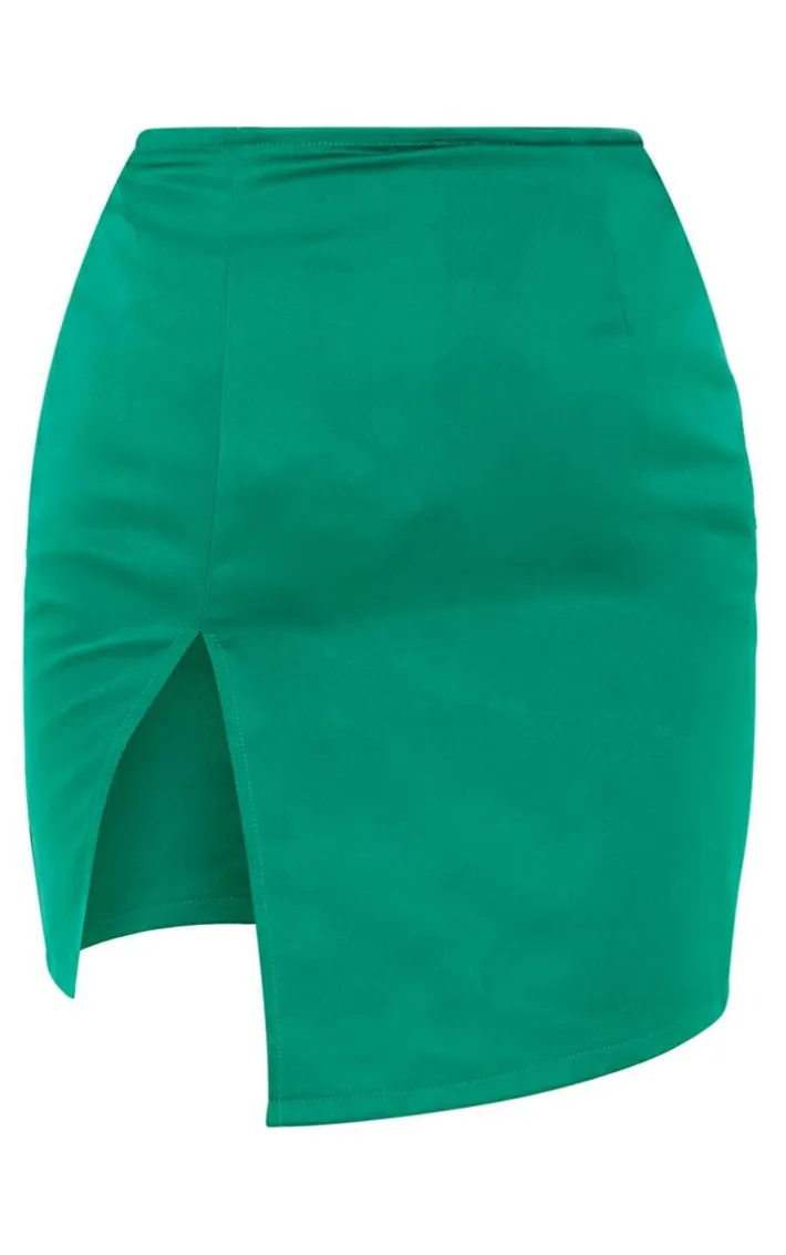 Take your weekend edit to the next level with this mini skirt. Featuring a bright green satin material with a tailored fit and split front design, we are obsessed. Wear with a white shirt and strappy heels for a date.