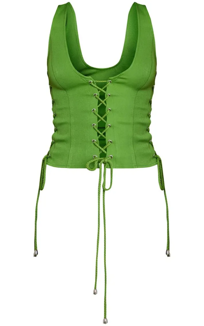 Nail new season trends with this top. Featuring a bright green woven material with lace-up detail and a plunge neckline, we’re obsessed. Style with light wash jeans and heels for a date.