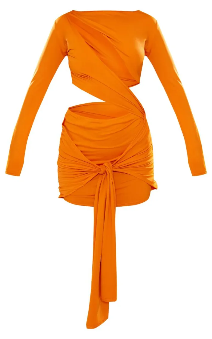 Stand out from the crowd for all the right reasons in this bright orange slinky cut out long sleeve knot bodycon dress. Brought to you in a bright orange slinky material with a cut out design, long sleeves and knot detailing, how can you say no? Style this bodycon dress with heels and gold accessories for a look we just can’t get enough.