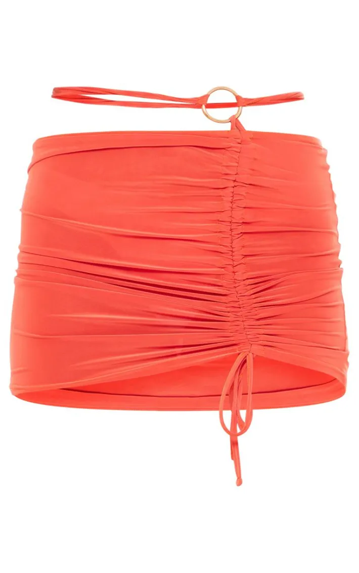 Bring all the bold hues to your new season wardrobe with this bright orange slinky ring detail ruched side mini skirt. Made from a bright orange slinky material with a ruched side design, ring detailing and a mini fit, how can you resist? Style this mini skirt with a racer neck top and heels for a look worthy of your weekend plans.