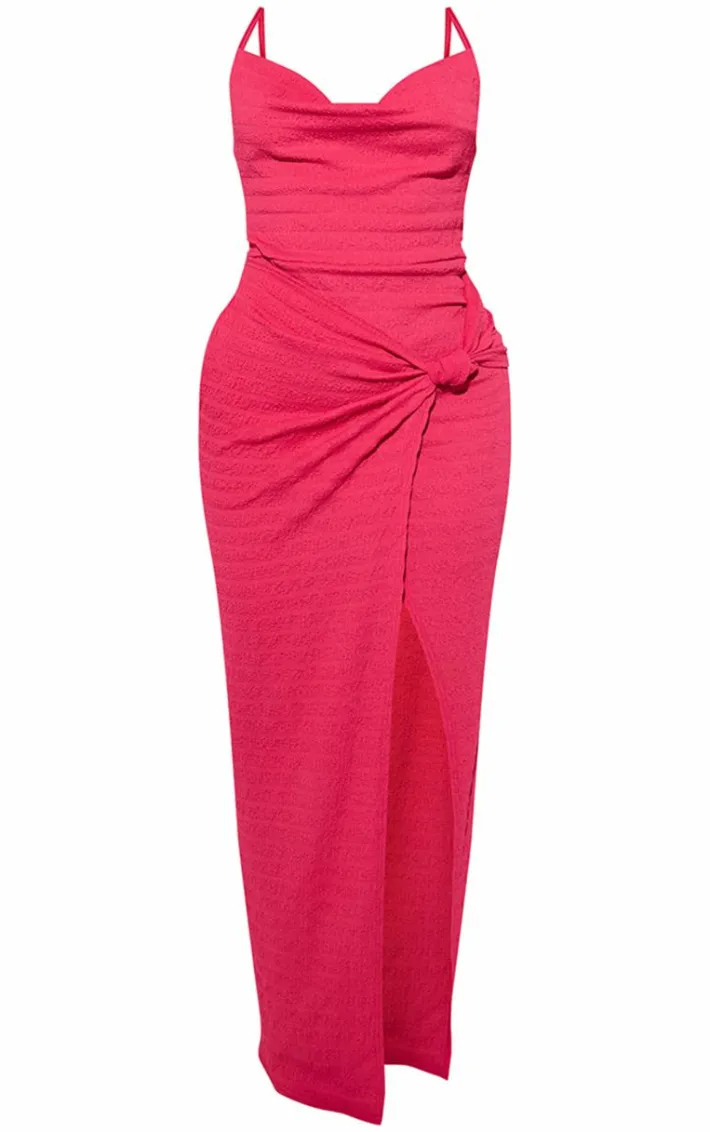 Add some statement hues into your look with this bright pink textured cowl knot detail maxi dress. This maxi dress is brought to you in a bright pink textured material with a cowl neck, a knot detail and a maxi length, what’s not to love? This maxi dress is calling your name. Style this with your dreamy high heels and accessories for a look like no other.