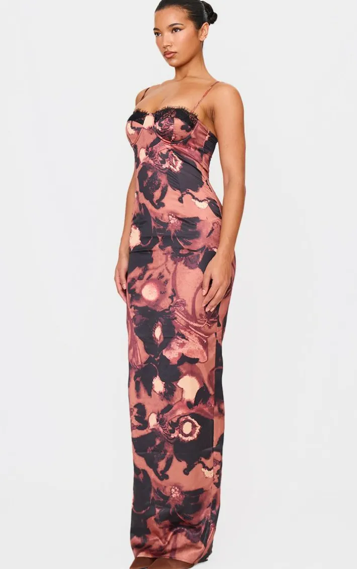 When the weekend calls, so does this brown abstract floral print lace trim maxi dress. Brought to you in a brown material with an abstract floral print design and a lace trim, you are sure to feel fiercely feminine in this maxi dress. Team with a pair of heels and your go-to accessories to finish off the look everyone is loving.
