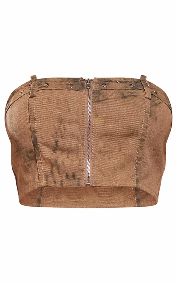 Add some edge to your look with this brown acid wash studded zip up bandeau crop top. This crop top is brought to you in a brown acid wash material with a studded design, zip detailing and a bandeau style, how could you say no? With it’s cropped length you’ll be having heads turn. Just add the matching pants, boots and accessories for a look like no other.