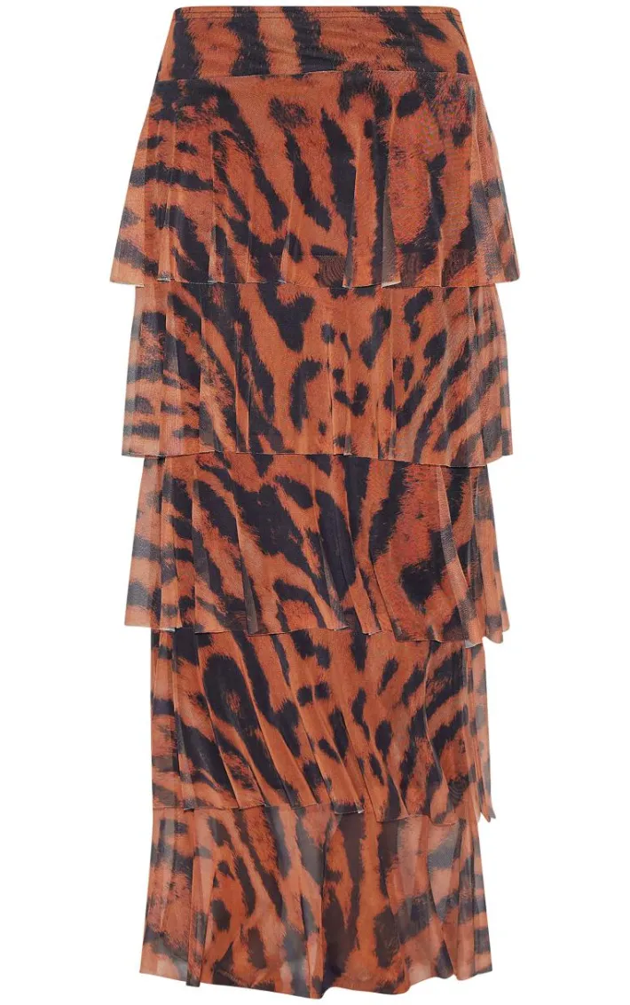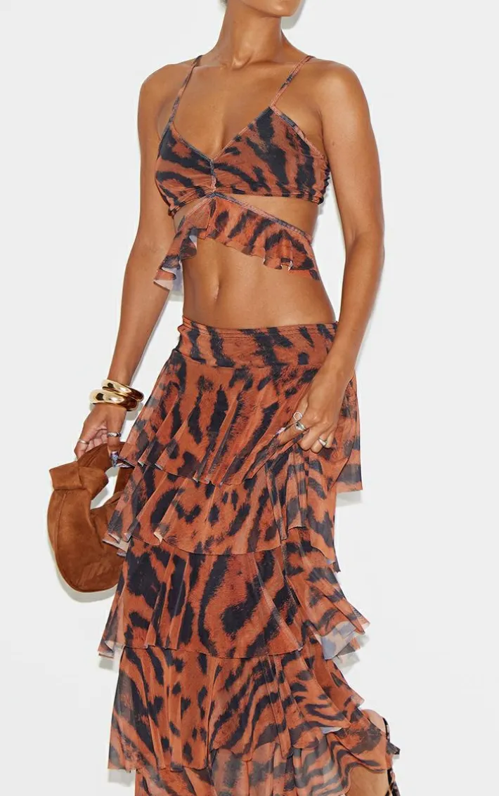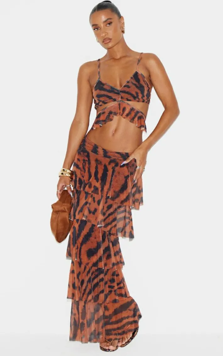 Say hello to this brown animal printed mesh rara maxi skirt. Brought to you in a brown animal printed mesh material with a rara design, this maxi skirt is sure to make a weekend statement. Style with the matching top, neutral heels and a chocolate shoulder bag for a look that won’t go unnoticed.