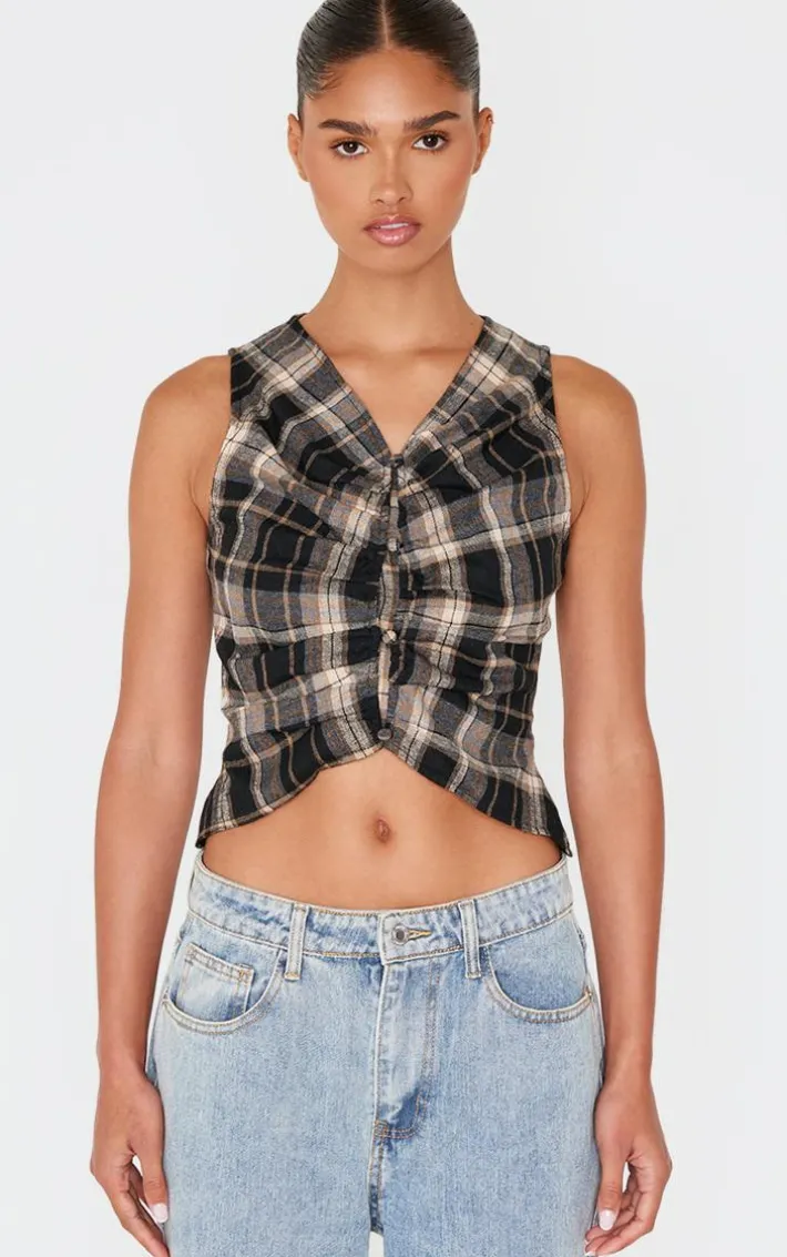 Keep it chic whatever your weekend plans with this brown check ruched long front top. Brought to you in a seasonal brown tone with a check design, flattering ruched front and overall cinched look, how can you say no? Team with a pair of jeans and simple accessories to really make an impact.