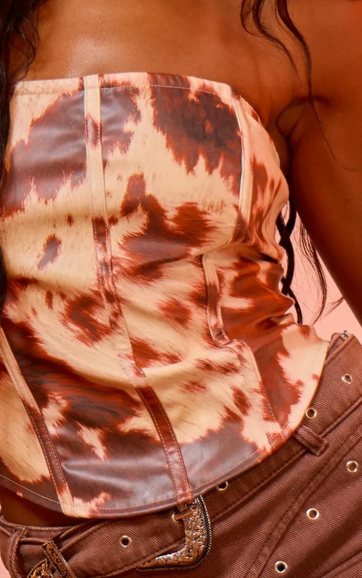 Inject some fierce animal prints into your new season wardrobe with this brown cow print faux leather corset. Made from a brown hue faux leather material with a cow print design and a figure-flattering fit, how can you resist? Style this faux leather corset with a mini skirt, heels and gold accessories for a look that is sure to have eyes on you all night long.