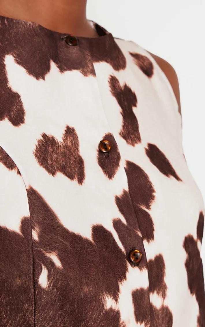 Elevate your new season wardrobe with statement prints in this brown cow print longline bengaline vest. Brought to you in a brown hue bengaline material with a cow print design, this longline vest is a must have. Style with shorts, slip on heels and simple accessories for a look you’ll be reaching for again and again.