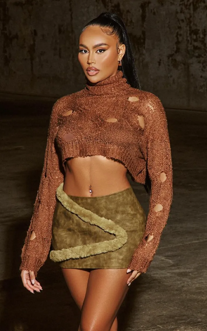 Hit refresh on your wardrobe this season with this brown cut out high neck knitted crop top. Brought to you in a brown knitted material with a cut-out neck detail and a figure-flattering fit, it’s got a yes from us. Whether you’re looking to add a touch of luxe to your wardrobe or all the cosy feels, this crop top is sure to do both. Simply add a mini skirt, court heels and your fave accessories for a look we’re loving right now.