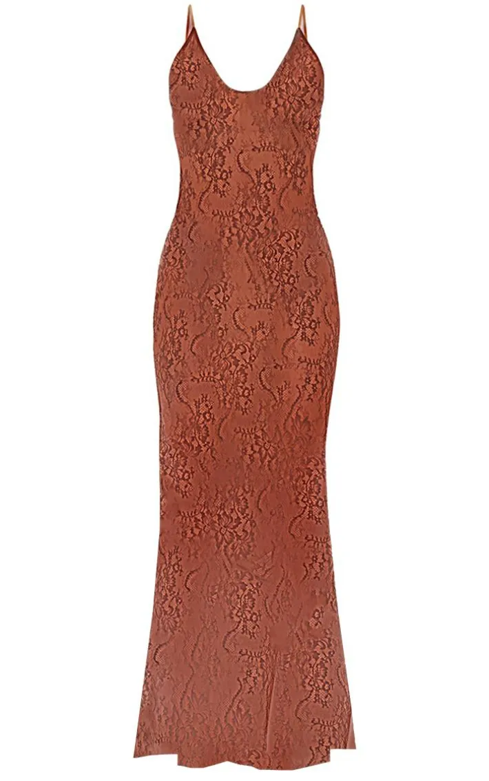 Take your weekend wardrobe that extra mile with this brown delicate lace skinny strap maxi dress, you won’t be able to resist this statement piece. It is made using a brown delicate lace material with skinny straps and a figure-worshipping fit, it’s a definite yes from us. Style this maxi dress with your highest heels and simple accessories for a look no one will forget.