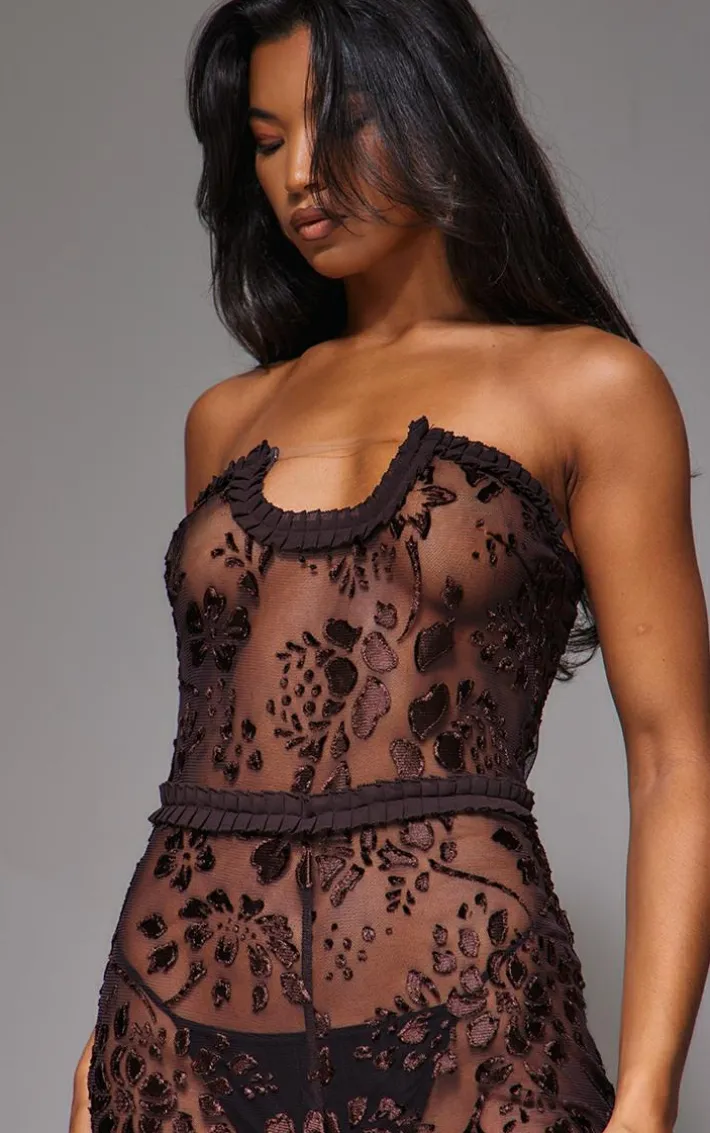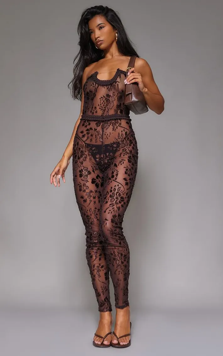 Look all kinds of glam in this brown devore mesh bandeau jumpsuit. Brought to you in a brown hue devore material with a mesh detail and bandeau neckline, this jumpsuit is everything you need and more. Style with brown heels and gold accessories to steal all the stares at your next event. We’re obsessed.