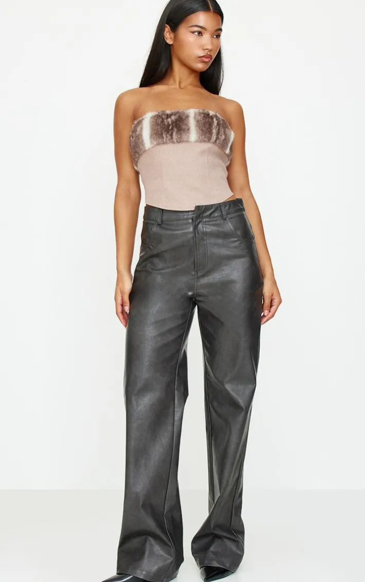 You need this brown faux fur trim wool look bandeau corset in your collection. brought to you in a brown wool look material with a faux fur trim, we just can’t get enough. Its bandeau fit is perfect for those day to night looks and beyond. Team with your fave accessories, heels and some wide leg pants for an elevated look we are obsessing over.
