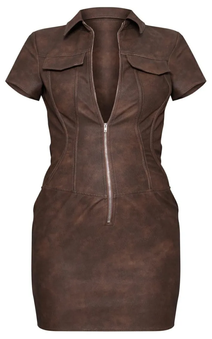 Get ready to have all eyes on you in this brown faux leather binding detail zip through bodycon dress. Made from a chic brown faux leather material and in a figure-flattering bodycon fit, this zip through dress is sure to be your new weekend fave. Simply style with some on-trend western style boots and statement accessories for a look that will have you earning some serious style points all season long.