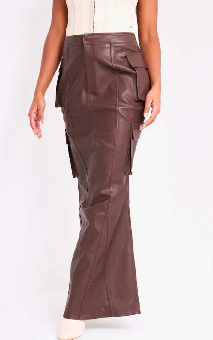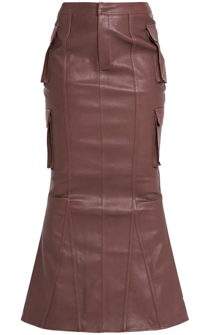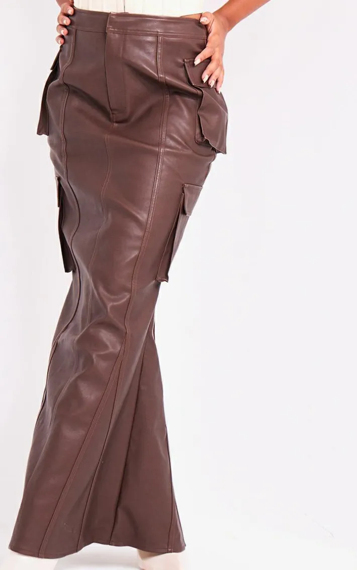 Stay on-trend for the new season and beyond in this brown faux leather cargo maxi skirt. Brought to you in a brown faux leather material with a cargo design and a flattering maxi fit, how can you resist? Perfect for dressing up or down to suit your plans, this maxi skirt is sure to be a staple in your wardrobe, Style with a corset top and heels for a fierce look worthy of your weekend plans.