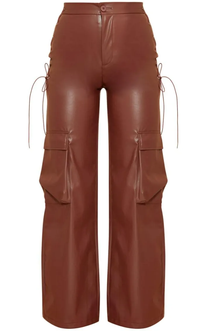 Get your new season look on point with these brown faux leather lace up cargo pants. Brought to you in a brown hue faux leather material with lace up detailing and an on-trend cargo design, what more could you ask for? Style these cargo pants with a bodysuit, heels and sunglasses for a fierce weekend-worthy look that won’t go unnoticed.