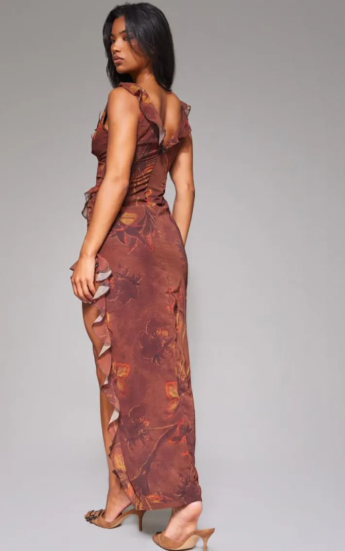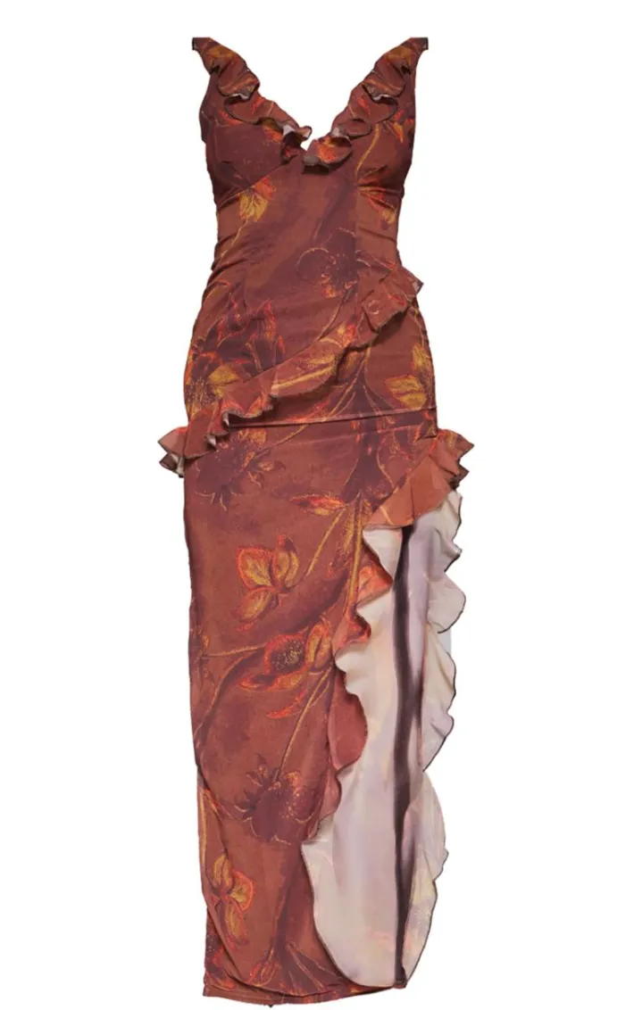 Up your style game with this brown floral asymmetric frill split maxi dress. We’re loving a brown shade this season, paired with a floral design, asymmetric frill detail and an unreal leg split, this dress is calling your name. Style with some neutral heels, a brown shoulder bag and your fave accessories to turn heads for the right reasons.