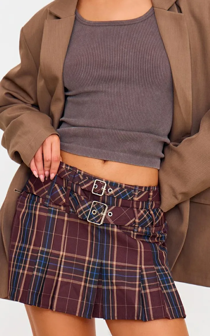 Add some chic prints to your new season wardrobe with this brown gingham double buckle pleated mini skirt. Brought to you in a brown hue gingham material with a double buckle detail and pleated design, this mini skirt is all the new you need. Team with a knitted top, slip on cosy boots and an oversized blazer for a cold weather fit we’re loving.