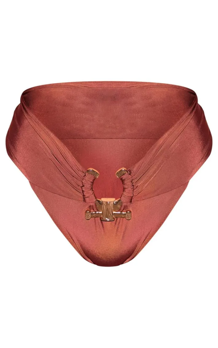 Turn up the heat in these brown hammered trim high waist bikini bottoms. Brought to you in a brown material with a hammered trim detail and high waist design, these bikini bottoms are a must-have. Style with the matching bikini top and gold accessories to get your glow on this season.