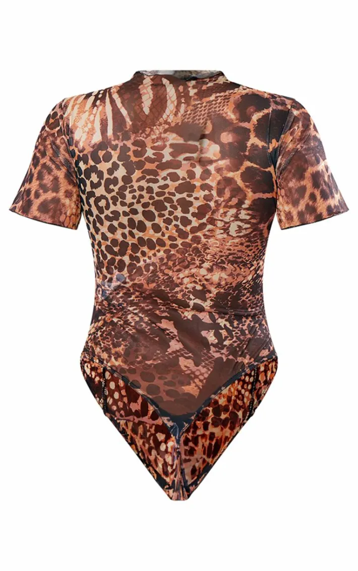 Add some statement prints into your collection with this brown leopard print mesh exposed seam bodysuit. Brought to you in a brown mesh material with a leopard print design, what more could you want ? With an exposed seam, this bodysuit is all you need to be seriously chic. Team with a mini skirt and a pair of heels to finish off the look we are obsessing over.