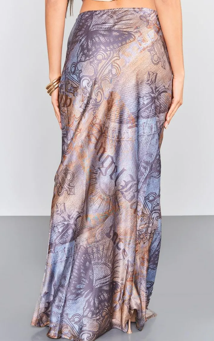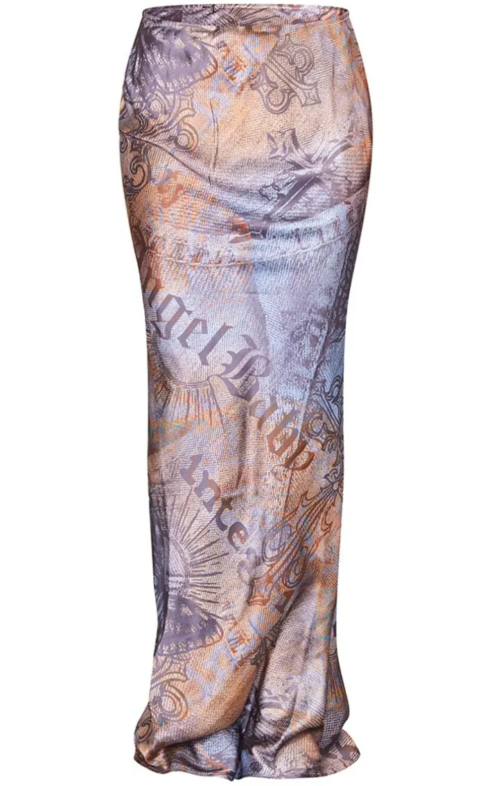 Take your weekend look to a whole new level with this brown newspaper print satin basic maxi skirt. Brought to you in a brown satin material with a newspaper print design and a flattering maxi fit, how can you not be obsessed? Style this maxi skirt with a corset top, your highest heels and gold accessories for a look they won’t be able to take their eyes off.