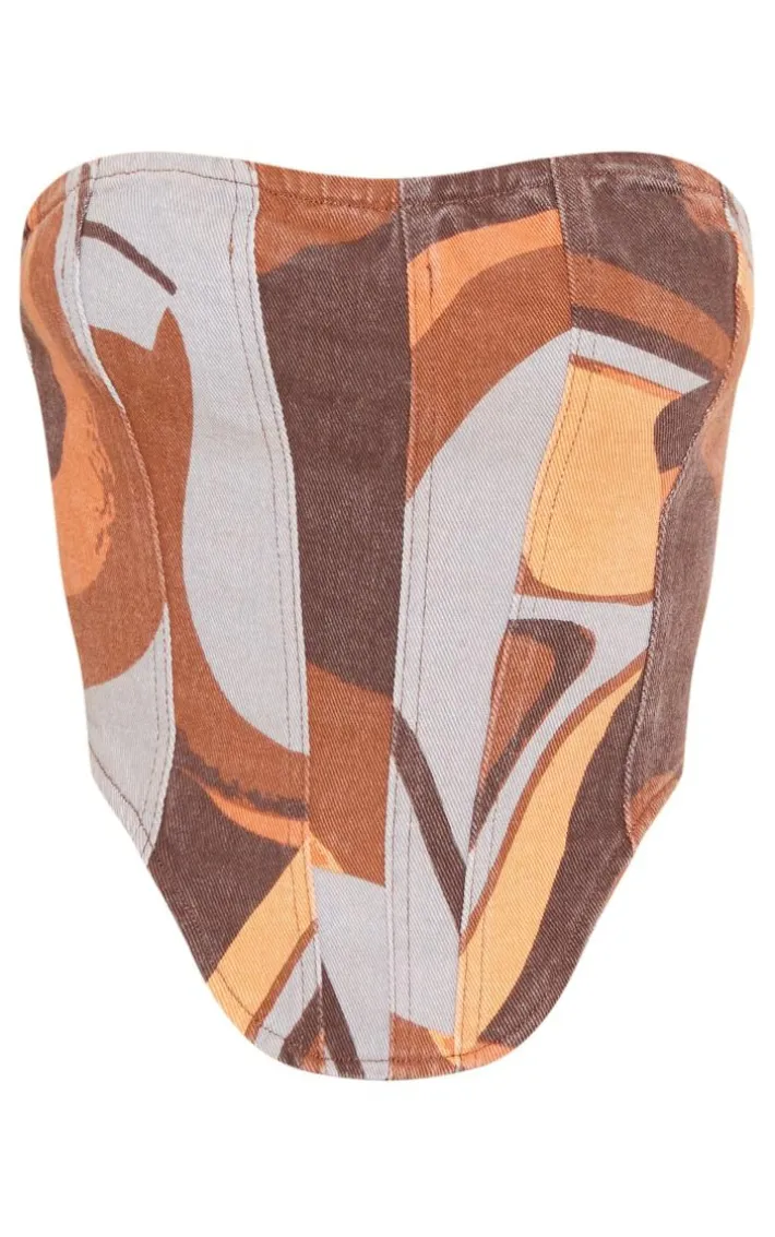Add all the fierce vibes to your weekend wardrobe with this top. Featuring a brown denim material with a retro swirl print and a panelled design. Wear with the matching skirt, a faux leather jacket and heeled boots for a look that is sure to get you noticed.