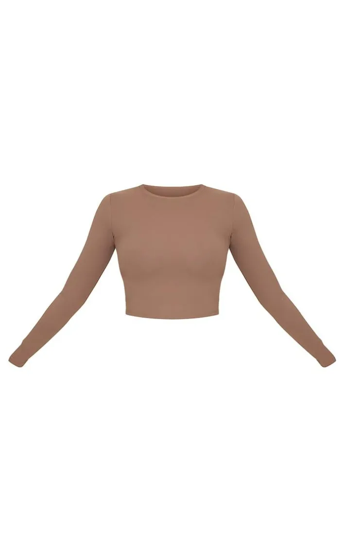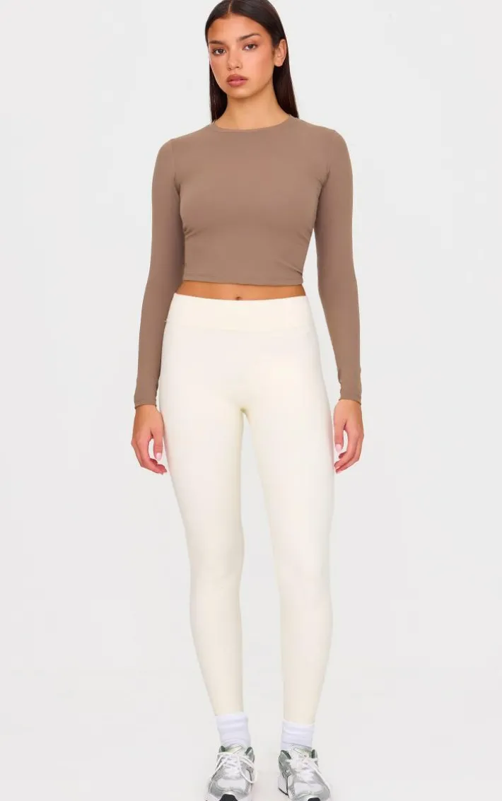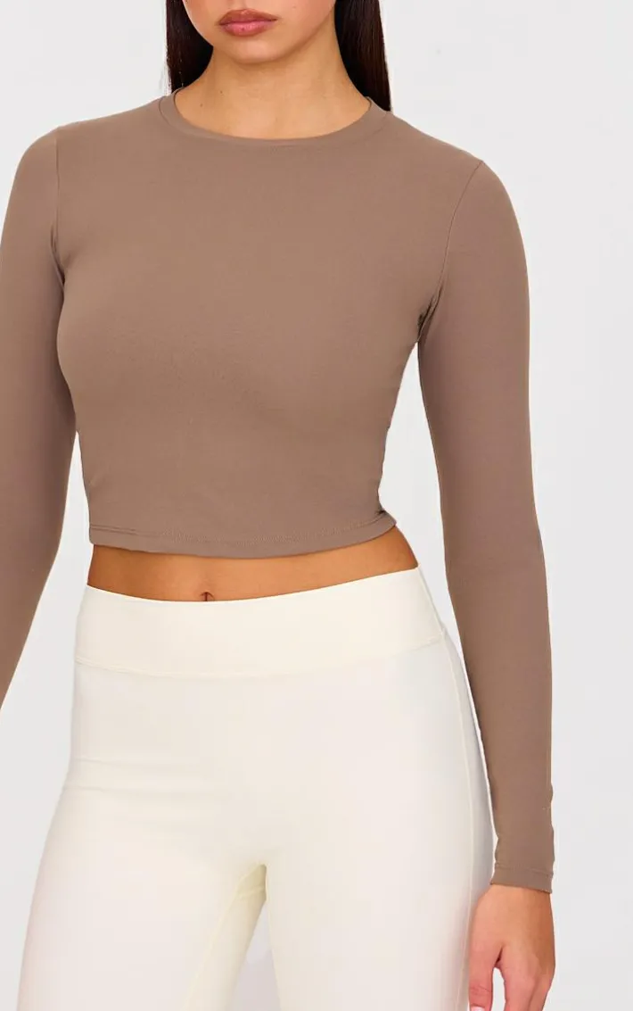 We can’t stop crushing on this staple gym top. Featuring a brown sculpt material with long sleeves and a figure-flattering fit, what’s not to love? For a sporty finish pair with leggings, slides and simple accessories.