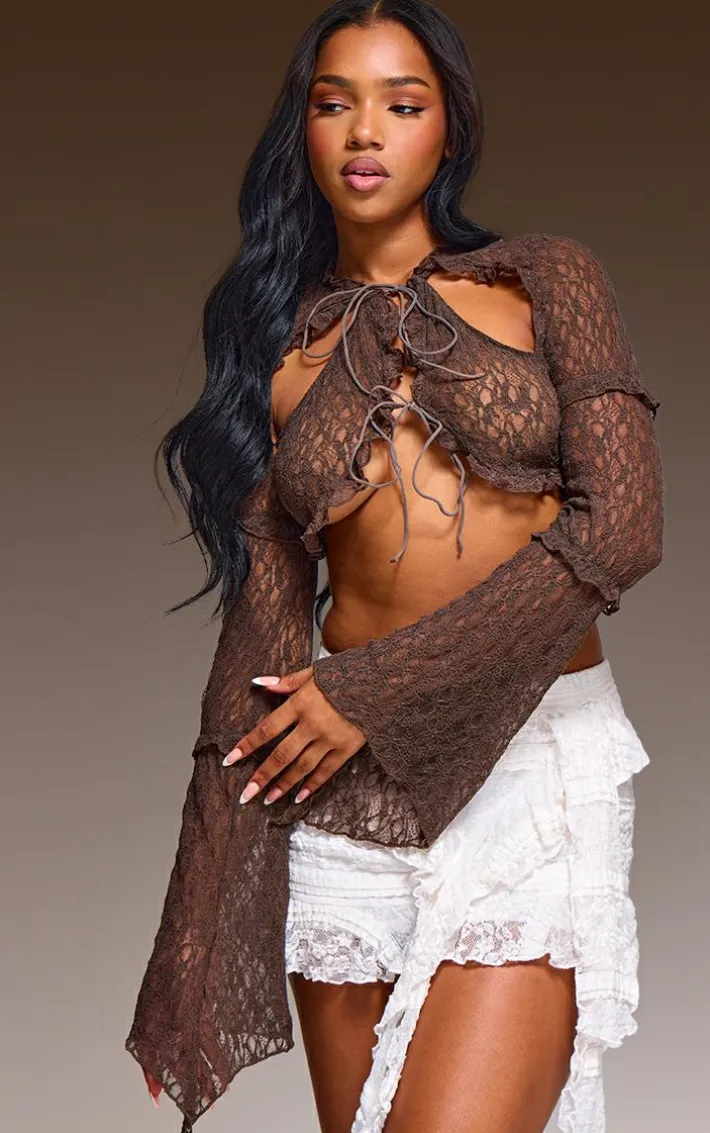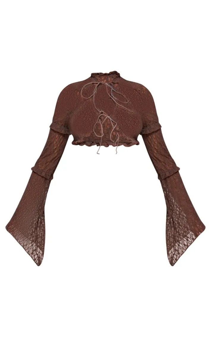 You can never have enough tops so why not treat yourself to this brown sheer lace frill detail crop top. Brought to you in a brown sheer lace material with a frill detail, this crop top is at the top of our most wanted list. Style with a mini skirt, knee high boots and simple accessories for a look that won’t miss this season.