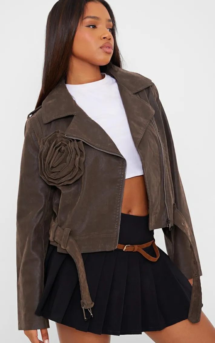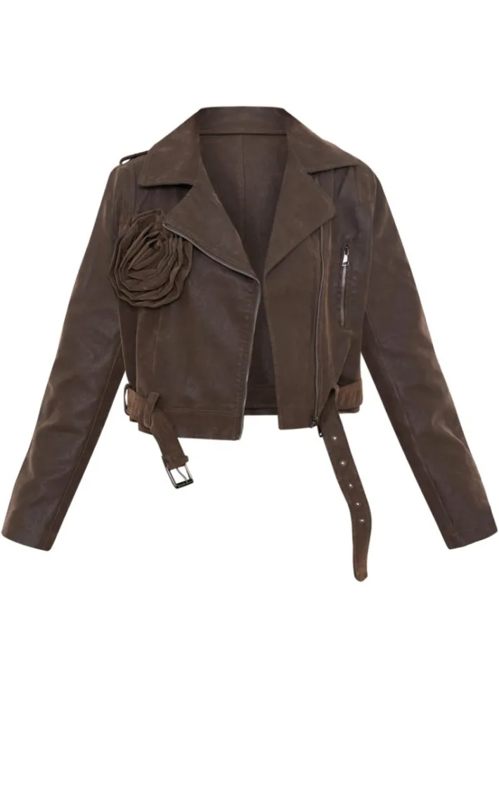 Switch up your new season style game with this brown soft faux leather flower detail crop jacket, you won’t be able to resist. This jacket features a brown soft faux leather material with a flower detail and a cropped length, it is perfect for dressing up or down. Team with blue jeans, sneakers and hoop earrings for a look everyone will want.