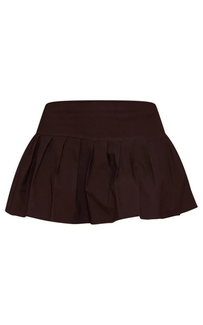 Elevate your weekend wardrobe with this statement skirt. Featuring a brown stretch woven material with pleat detailing and a micro mini length. We are obsessed with this teamed with a cropped blazer and tie-up heels.