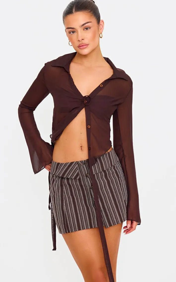 For those weekend plans, this brown striped shirt detail woven mini skirt is essential. Brought to you in a brown woven material with a striped design and a shirt detail, this mini skirt is the ultimate must-have for your new season wardrobe. Team with a long sleeve top and a pair of heels to elevate the look to new heights.