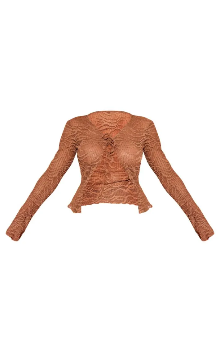 Give your new season wardrobe the luxe upgrade it deserves with this brown textured tie front beach shirt, you won’t be able to resist. This shirt features a brown textured material with a tie front design and long sleeves. Pair this textured shirt with the matching shorts, sandals and gold accessories for a look everyone will want.