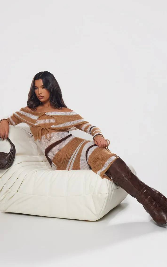 Inject all the luxe vibes into your weekend wardrobe with this brown tonal soft knit foldover tie detail bardot maxi dress. Brought to you in a brown tonal soft knit material with a foldover design and tie detail, what’s not to love? This maxi dress hugs your figure in all the right places and shows off your sultry side. Team with knee-high boots and gold accessories for a look that will be unforgettable.
