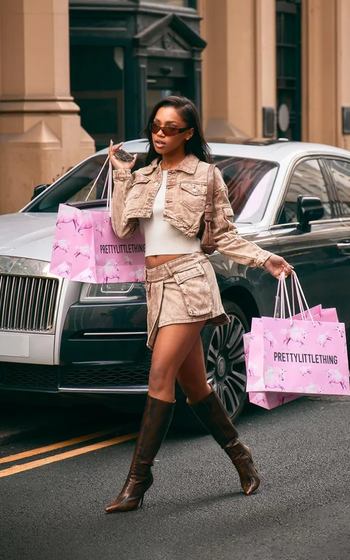 Whatever your plans this season, you won’t be able to resist reaching for this brown washed pocket detail asymmetric micro mini denim skirt. It is made using a brown washed denim material with an asymmetric design and a micro mini length. Style this skirt with the matching jacket, knee high heeled boots and your fave accessories for a look everyone will want.