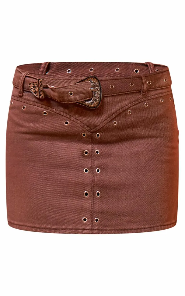 Take your look to a whole new level with this brown western style silver buckle denim mini skirt. Brought to you in a brown hue denim material with a western style and silver buckle detailing, how can you not be obsessed? Style this mini skirt with a corset top, heels and statement accessories for a look that will have all eyes on you.