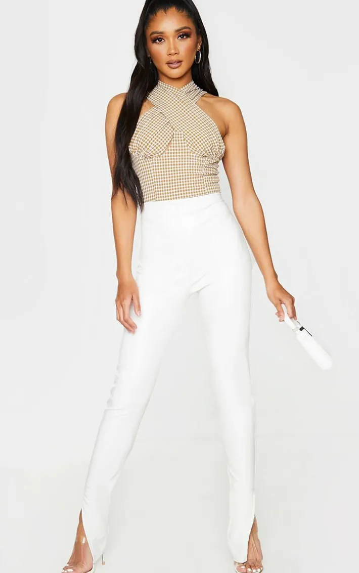 This checked corset is at the top of our new season hit list doll. Perfect for dressing up or down, work your styling techniques to make this corset top fit for any occasion. Featuring a brown woven material with a check print, a cross over strap design and zip back fastening, we just can’t get enough of this haltenreck corset. Team this with white pants, heels and accessories for a look that will have all eyes on you.