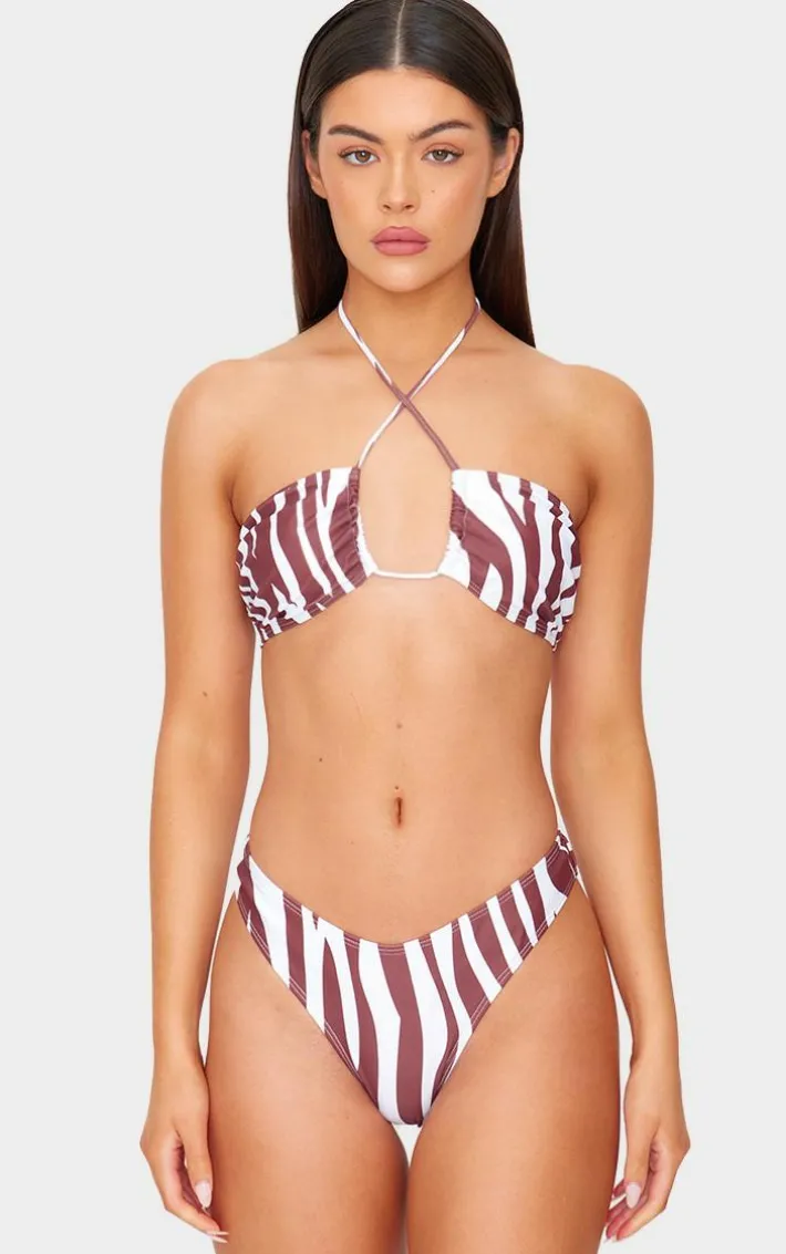 Add some animal prints to your swimwear collection with this brown zebra print halter tie bikini top. Brought to you in a brown hue material with a zebra print design and a halter tie fastening, what more could you need? Pair this bikini top with the matching bottoms and simple accessories for a look that is sure to show off your tan.