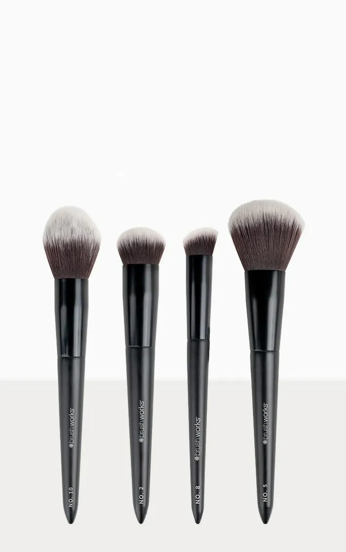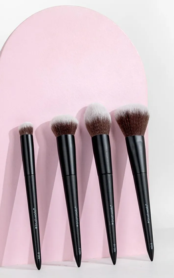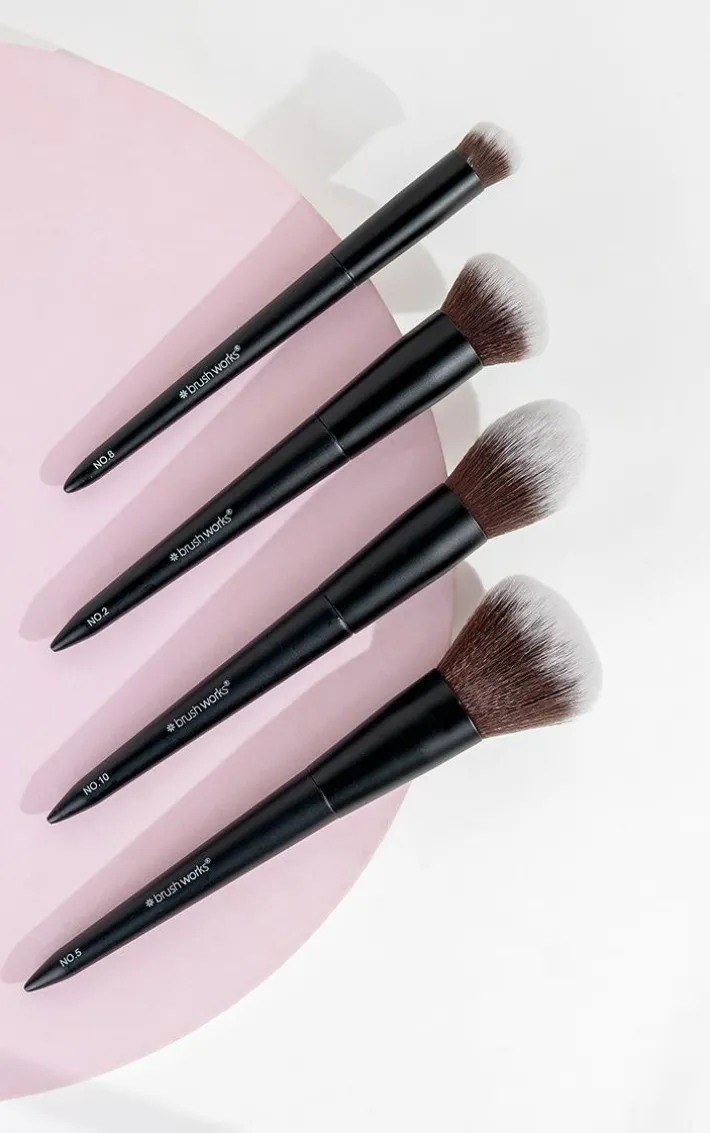 Introducing the Brushworks Buff and Blend Face Set, a carefully curated collection of four essential brushes designed to elevate your makeup routine. This set includes the No. 10 Bronzer Brush, No. 2 Buffing Foundation Brush, No. 8 Precise Angled Concealer Buffing Brush, and No. 5 Powder Brush, each selected to help you achieve the perfect base. Featuring super soft taklon synthetic bristles, these brushes ensure that your products glide on smoothly and evenly, while being extremely gentle on the skin. The No. 10 Bronzer Brush, featuring a density scale rating of 0, is a super fluffy brush, perfect for achieving a natural sun-kissed glow. For a smooth foundation application, turn to the No. 2 Buffing Foundation Brush. With a density scale rating of 5, this brush flawlessly buffs liquid and cream foundations into the skin, providing an airbrushed finish. The No. 8 Precise Angled Concealer Buffing Brush has a density scale rating of 7. Its angled design allows for targeted coverage, effortlessly blending concealer to conceal imperfections. Complete your base routine with the No. 5 Powder Brush which has a density scale rating of 0. This brush is perfect for setting your makeup with powder, leaving you with a smooth and velvety finish.