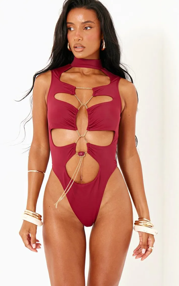 Make heads turn on your next vacay in this burgundy chain detail cut out high leg swimsuit. Brought to you in a burgundy hue material with a cut out design, a flattering high leg fit and chain detailing for that extra added edge, we are obsessed. Just add statement accessories to this burgundy swimsuit to instantly elevate the look.