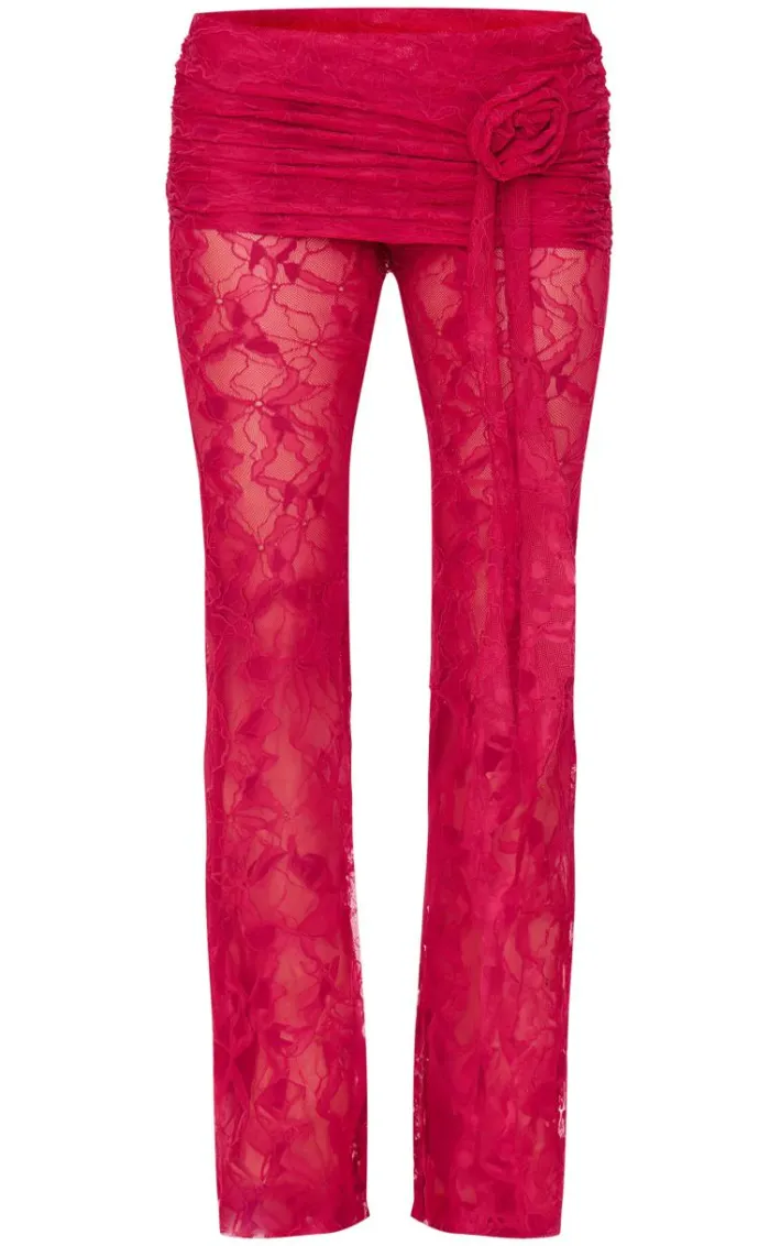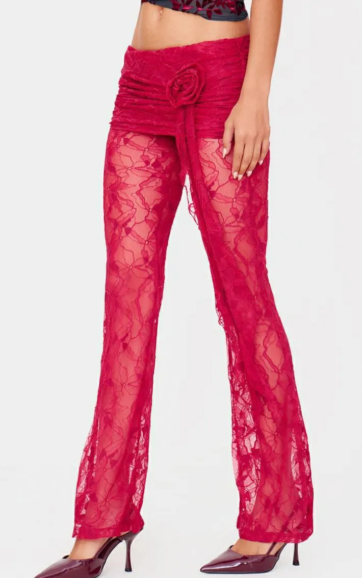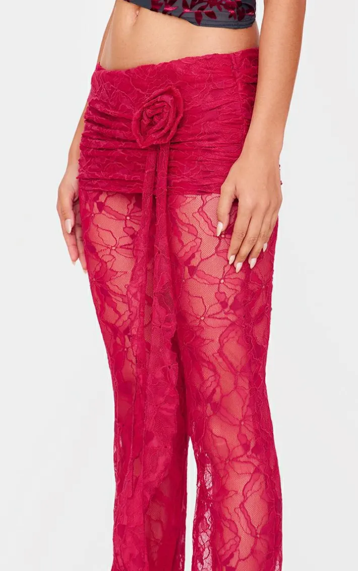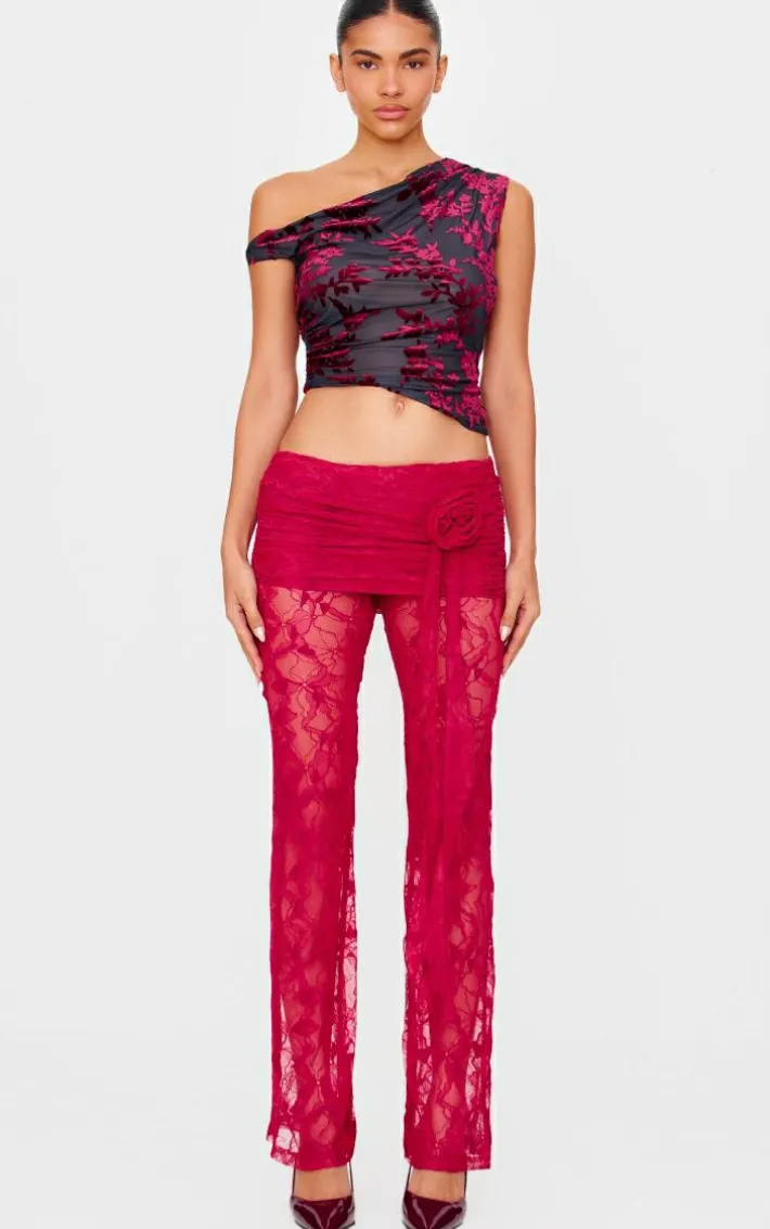 Stand out from the rest in these burgundy corsage detail straight leg lace pants. Brought to you in a burgundy hue lace material with corsage detailing and a straight leg fit, how can you resist? Style these lace pants with a crop top and court heels for a look that won’t be forgotten this weekend.