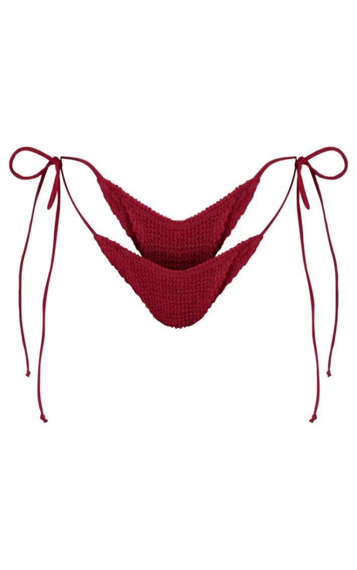 Take the stress out of weekend styling with these burgundy crinkle tie side bikini bottoms. Brought to you in a burgundy crinkle material with a tie side, you really can’t go wrong with these bikini bottoms. Style with the matching bikini top and gold accessories for a look that will have eyes on you for all the right reasons.